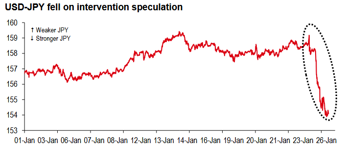 USD-JPY experienced a sharp decline late Friday during the US trading session, following reports that the New York Federal Reserve (Fed), on behalf of the US Treasury, conducted rate checks (The New York Times, 23 January). This move came after an earlier surge in USD-JPY during the Bank of Japan (BoJ) Governor Ueda’s press conference, and subsequent remarks from Finance Minister Katayama highlighting the Japanese government’s heightened vigilance over FX market developments (Bloomberg, 23 January). Given how the Japanese and US authorities have already emphasised their shared concerns about the JPY a couple of weeks ago (Bloomberg, 13 January; US Treasury’s readout on 14 January), this recent rate check suggests joint intervention is possible over the near term.