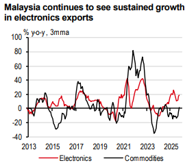 First, Malaysia’s exports to the US have moderated, reflecting the fading impact of front-loaded trade. However, second, Malaysia has benefitted from still-elevated AI-driven demand. While commodity exports remain in the doldrums, electrical machinery & electronics (E&E) exports continue to expand at an impressive double-digit pace. On top of trade, the recently signed Reciprocal Trade Agreement (RTA) between Malaysia and the US also reduces trade uncertainty, with Malaysia being the first economy in ASEAN to sign a deal.