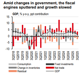 However, just like elsewhere, we expect 2026 to be a tough year. Payback from front-loading demand will likely be a headache for the economy, not to mention the potential slowdown in government spending with Thailand expected to undergo another election in February 2026.