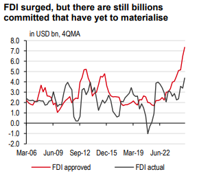 The fiscal drag then had a domino effect on other aspects of the economy. The most important was private investment. For instance, business sentiment has fallen to its lowest level after the COVID-19 pandemic. Consequently, the share of firms which intend to expand their production in the following quarter has fallen to a post-pandemic low. Moving in parallel is a sharp decline in FDI applications. In all, we expect growth in 2026 and 2027 to come in below potential at 5.2% and 5.6%, respectively, with both private and government investment weighing on growth.