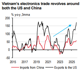 Similar to other tech-exposed economies, Vietnam has also benefitted from surging AI-driven demand. In particular, its electronics exports to the US alone jumped 150% y-o-y on a three-month moving-average (3mma) basis, pushing Vietnam’s total exports to the US up by 30% y-o-y.