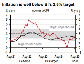 Indonesia’s post-pandemic GDP growth has been weak. Despite higher-than-expected 2Q25 GDP growth of 5.1%, we estimate that GDP is still c7.5% below its pre-pandemic trend. The highfrequency indicators like manufacturing PMI, credit, and consumer sentiment also point to softness.