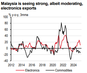Now that everyone in ASEAN-5 faces similar tariff rates, it’s likely that the trade and FDI dynamics will return to the starting point, meaning that Malaysia’s competitiveness remains. Recall that Malaysia was one of the main beneficiaries of earlier US-China trade tensions alongside Vietnam. Its FDI inflows have been consistently topping the region since late 2021, now standing at 4% of GDP in 1Q25 on a 4-quarter-moving average basis. The tariff rate is not the only factor, though undeniably important, in determining the attractiveness of an investment destination. Rather, FDI reflects investors’ long-term confidence in an economy, which involves a confluence of factors.