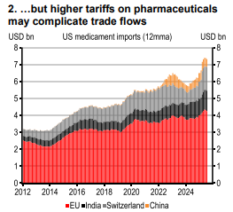 Over the past two weeks, the Trump administration has announced a 100% tariff on branded and patented pharmaceutical products, unless drug manufacturers relocate production to the US. In addition, a 10% tariff will be applied to softwood timber and lumber imports, and a 25% on kitchen cabinets, and upholstered wood furniture starting 14 October. These duties will, however, be capped at 15% for imports from the EU and Japan. Tariffs on films produced overseas have also been mooted.
