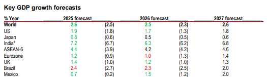 We recently revised up our global GDP growth forecasts a touch, reflecting stronger than expected growth in many countries in Q2 rather than an improving outlook. The biggest upgrades are to India, parts of ASEAN and Mexico. Still, we see global GDP growth slowing from 2.8% in 2024 to 2.6% in 2025 and 2.5% in 2026.