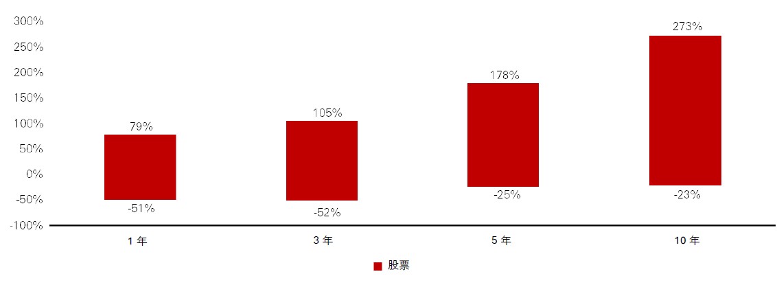 例如,左轴显示1999年至2024年间,环球股票在任何一年期内的表现介于 -51% 至79% 之间;而任何十年期内的表现则介于 -23% 至273% 之间。