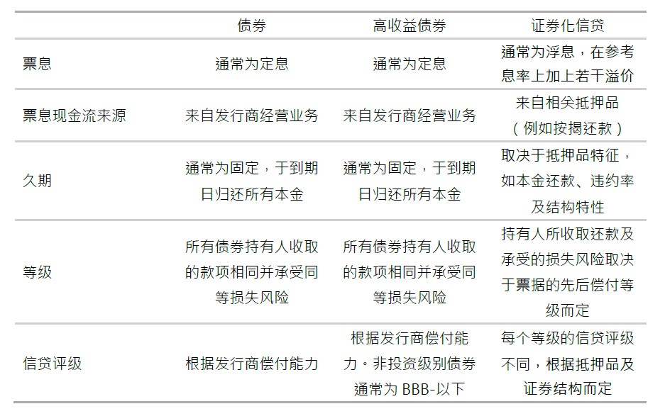 证券化信贷是一种资产类别,它包含债券或可产生现金流的资产所组成的工具,包括住宅及商业楼宇按揭贷款、汽车贷款、信用卡贷款等。这些欠缺流动性但可产生现金流的资产会被买入,然后通过证券化程序重新组合成不同级别的产品。