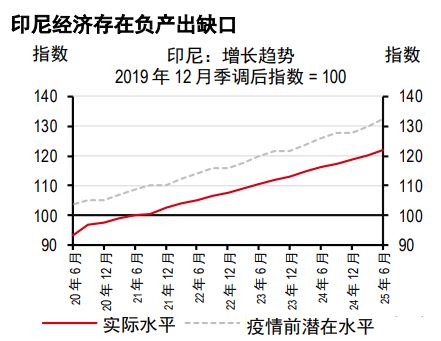 印尼疫情后的国内生产总值增长持续疲软。尽管 2025 年第二季国内生产总值增速达 5.1%,高于预期,但我们估计其国内生产总值仍比疫情前的趋势水平低 7.5%左右。制造业采购经理人指数、信贷和消费者信心等高频指标也指向经济疲软。